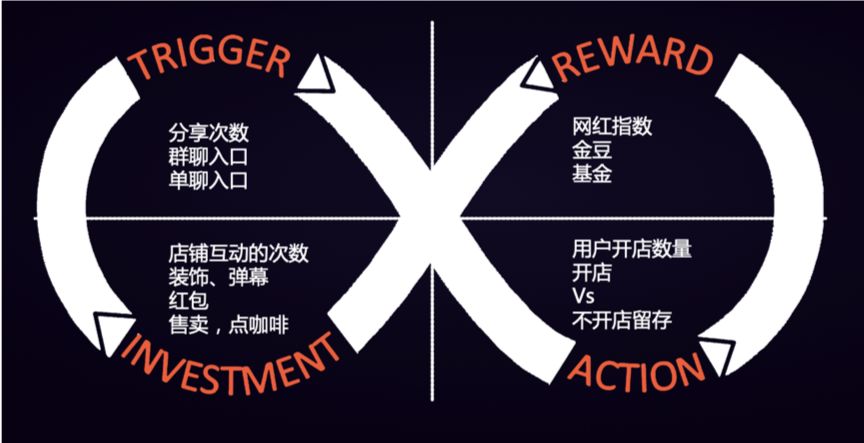 在HOOK模型里还有两层动作,一个是通过分享来分析哪些人是大V,哪些用户是可以帮助带流量的,如李诞,通过运营大V来产生更多流量;另一个是分析最容易吸引用户的是什么样的内容,哪个商品、店铺用户最愿意分享,从而进行商品维度的运营。
