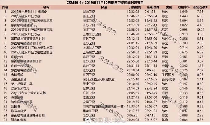 11月10日,易烊千玺、霉霉、胡歌、张艺兴、那英、李宇春、罗志祥、邓紫棋、秦岚、郎朗吉娜、戚薇李承铉等众多明星担任表演嘉宾,在浙江卫视播出的天猫双十一狂欢晚会,CSM59城收视率1.443。
