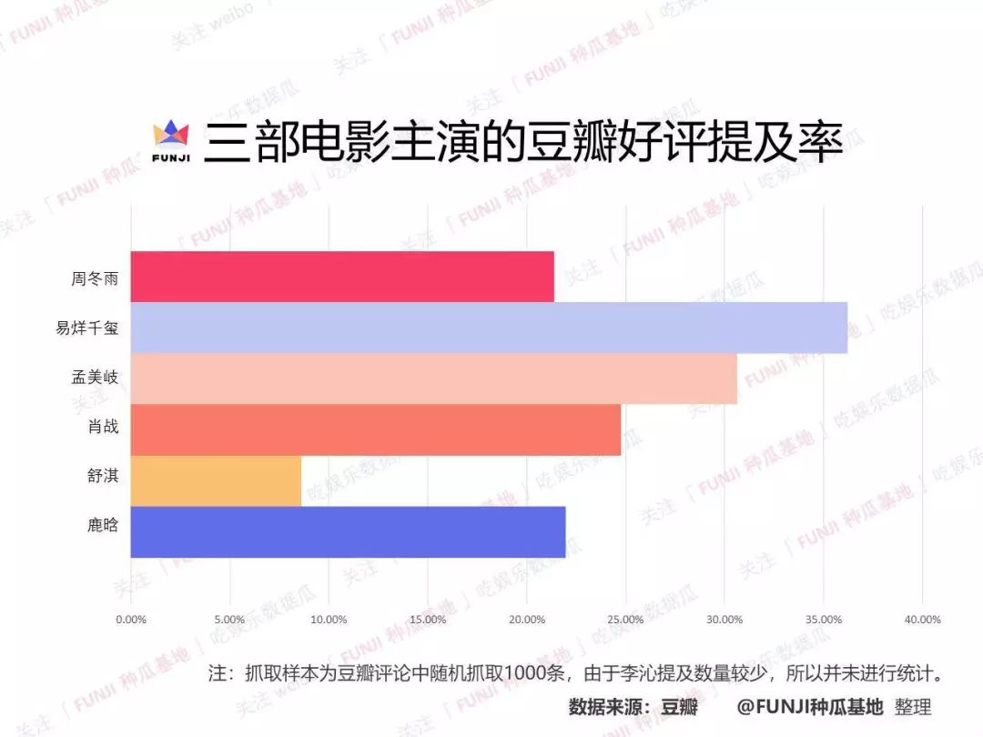 而在豆瓣评分最低的《上海堡垒》里,鹿晗的好评提及率依旧达到了21.98%,舒淇则只有8.5%。