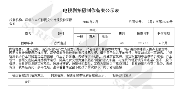 早在2016年9月,《鹤唳华亭》便出现在了电视剧备案中,当时的报备机构为中汇影视,可理解为该剧最早由中汇影视牵头打造。