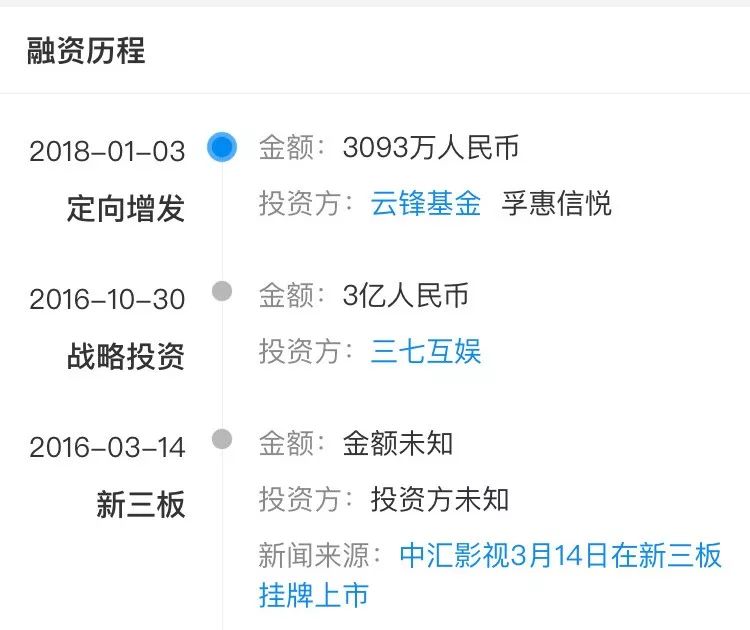 企查查信息显示,除了获得游戏大佬三七互娱3个亿投资,在2018年初中汇影视还获得3093万的定向增发,投资方为云锋基金和孚惠信悦。