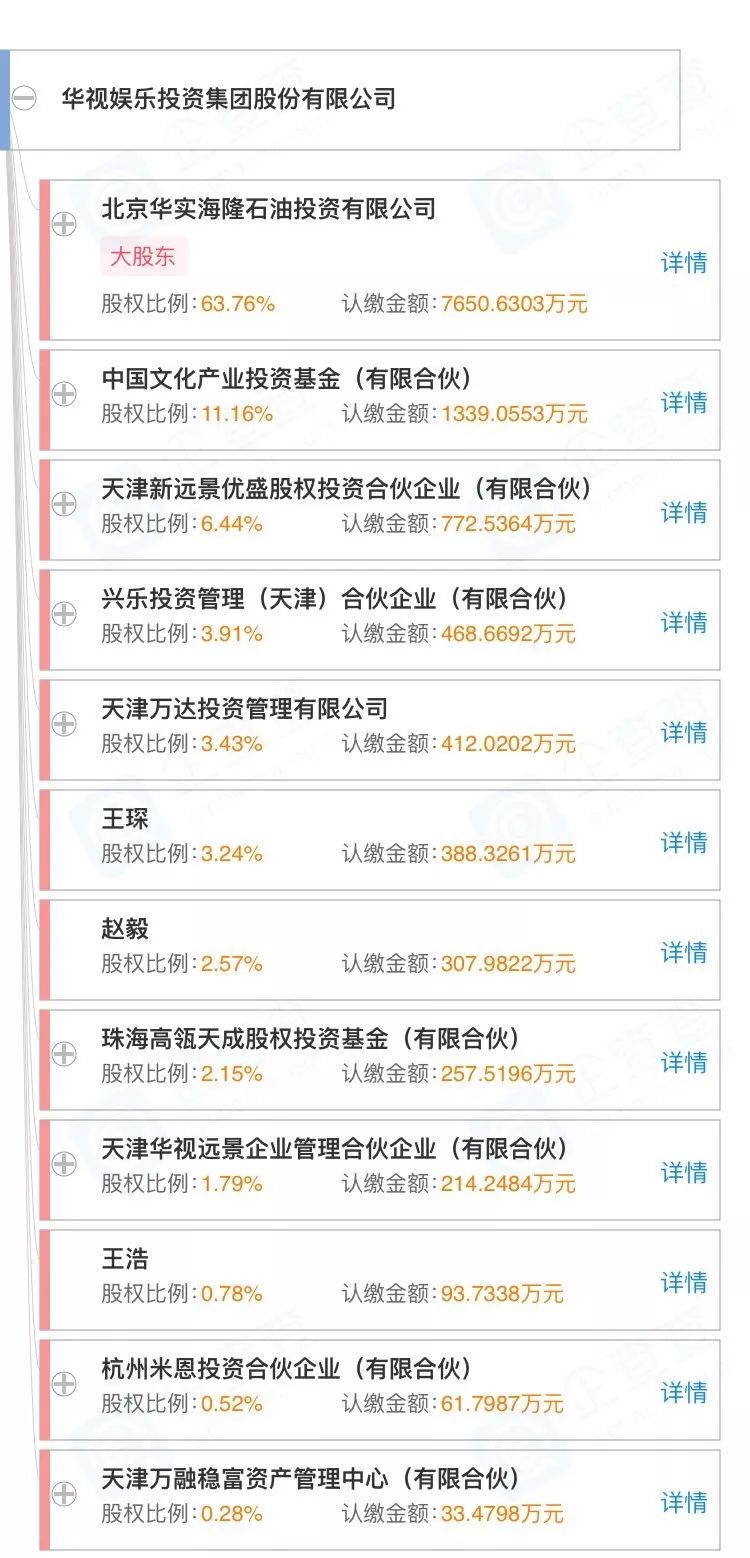 华视娱乐成立于2005年,由从事油田服务、油田装备的海隆系掌门人张军设立。企查查显示,公司大股东为北京华实海隆石油投资有限公司,持股比例63.76%,其他主要股东还包括中国文化产业基金、万达集团、高瓴资本、远创资本等。