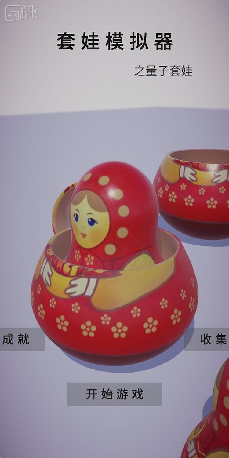 游戏的主界面十分朴素。正上方是游戏的全称《套娃模拟器之量子套娃》,左右两边的“成就”与“收集”都暂未开放,唯一一个能点的就是“开始游戏”。