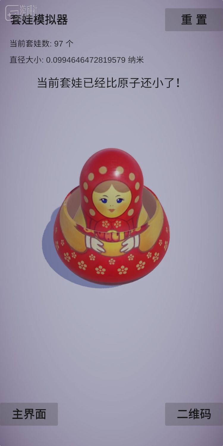 开始之后的游戏玩法也非常单调,玩家唯一能做的就是不断地点击屏幕中间,打开一个又一个的套娃。左上角的数据会告诉你目前已经开到了第几个套娃以及这个套娃的直径大小,而相应的直径大小则会有不同的文字描述。