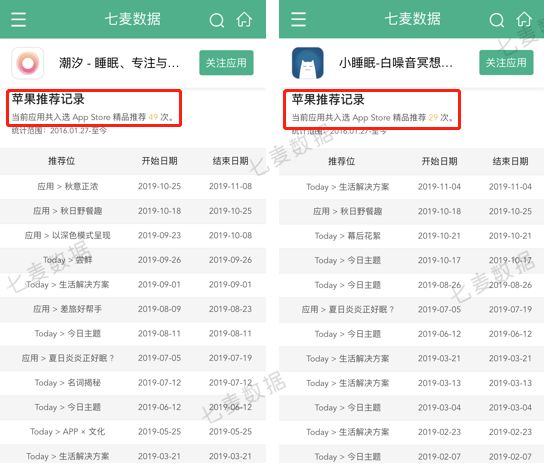 虽然小睡眠是在 2017 年 1 月才上架 App Store,但其也凭借功能有创意,贴近用户生活而获得苹果精品推荐 29 次。此外助眠 App 潮汐被推荐 49 次。