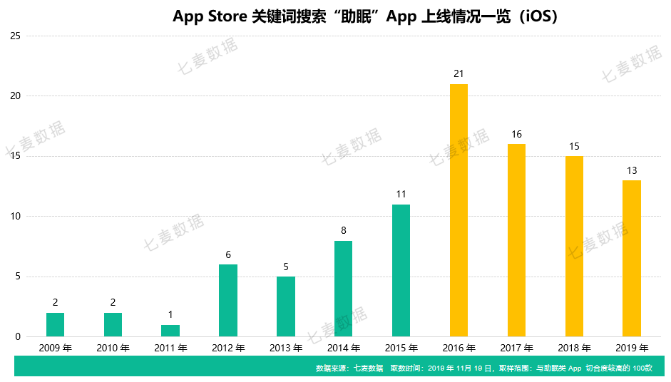 不过其实在 2016 年,小睡眠就在微信小程序当中爆红。自此,App Store 中也兴起了一波助眠类 App 的上架。七麦数据监测到,根据关键词 “助眠” 搜索结果筛选出的 100 款产品数据显示,2016 年开始助眠类 App 兴起,同时,有 65% 的助眠类 App 开始陆续上架。