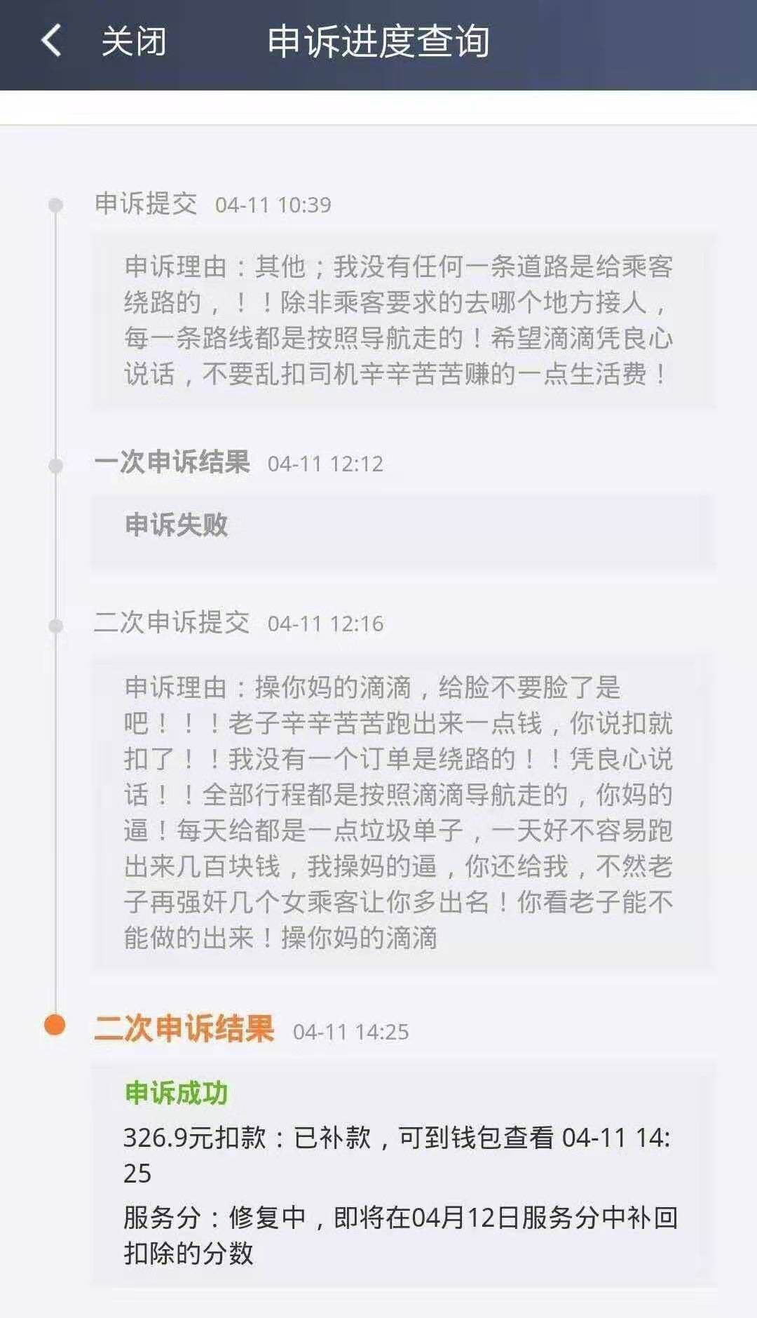 无独有偶,前段时间,一位滴滴司机分享了自己向平台申诉的图片:“好好的在平台上摆事实、讲道理,没用;非要把人逼急了,撒泼、爆粗口才能能解决问题。”