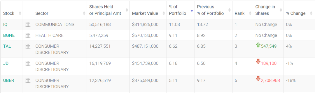 截至今年三季度末,据美国证券交易委员会(SEC)最新数据显示,在高瓴资本持仓中互联网公司依旧占据重要地位,拼多多、哔哩哔哩分别获177.92万股和291.87万股的增持。此外,高瓴资本持续加仓教育和医药领域,其中好未来、新东方获54.76万股和105.88万股增持,百济神州成为其第二大重仓股。