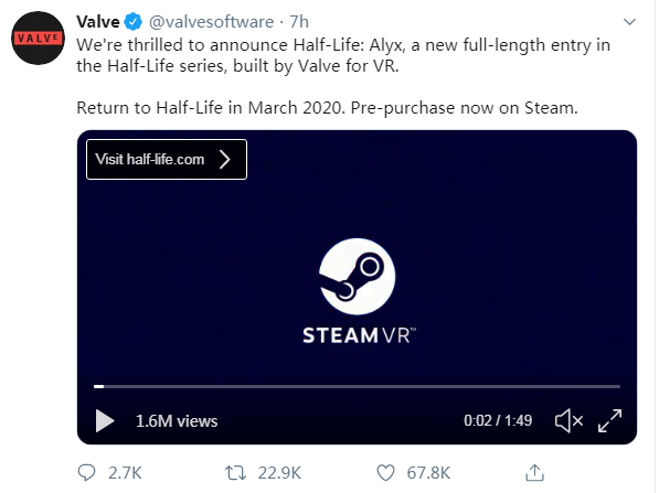 11月22日,Valve公布了最新VR大作《Half-Life: Alyx》(《半条命:阿莉克丝》)的具体上线时间:2020年3月。借此,Valve将会成为第一家推出VR版3A大作的游戏公司。