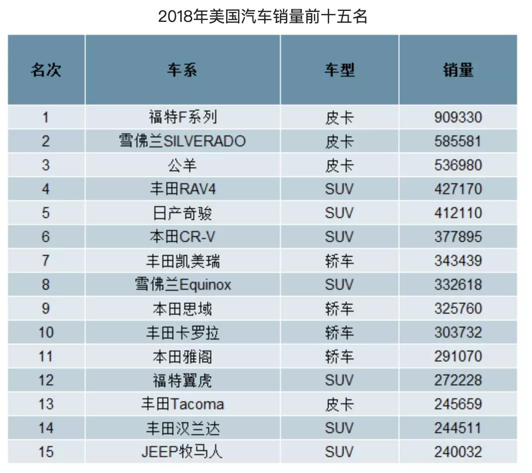 2018美国汽车销量排行TOP15;来源 / 中国产业信息网