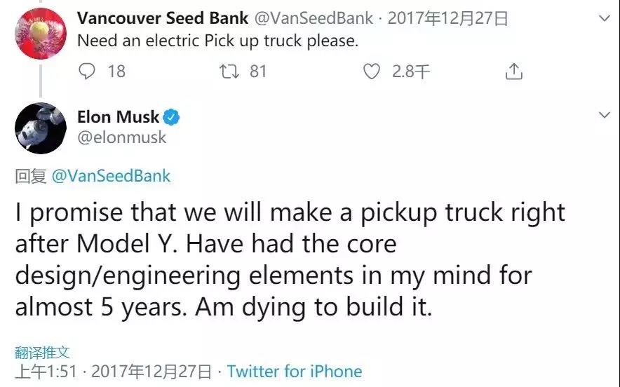 2017年12月,马斯克在推特上回复网友称特斯拉将会在Model Y之后推出特斯拉电动皮卡,对于这个电动皮卡项目的核心设计和工程化元素,他已经思考了5年。马斯克迫切想要生产皮卡的心态可见一斑。