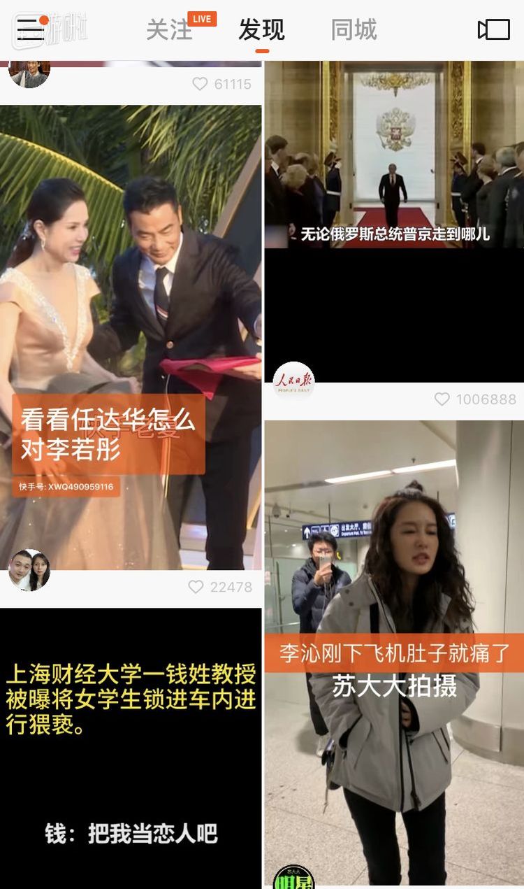 打开“发现”一栏,你会看到首页热门全被一些以前根本不可能上快手的主流媒体所挤占——他们的视频除了时事新闻、各路名人就是手游广告。但人们来到快手并不是为了看另一个微博热搜。
