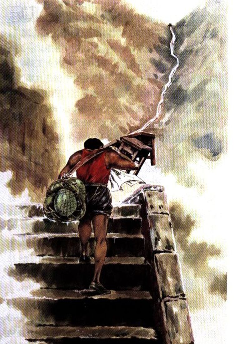 在陡直的似乎没有尽头的山道上,一个穿红背心的挑山工给肩头的重物压弯了腰,他一步一步地向上登攀。