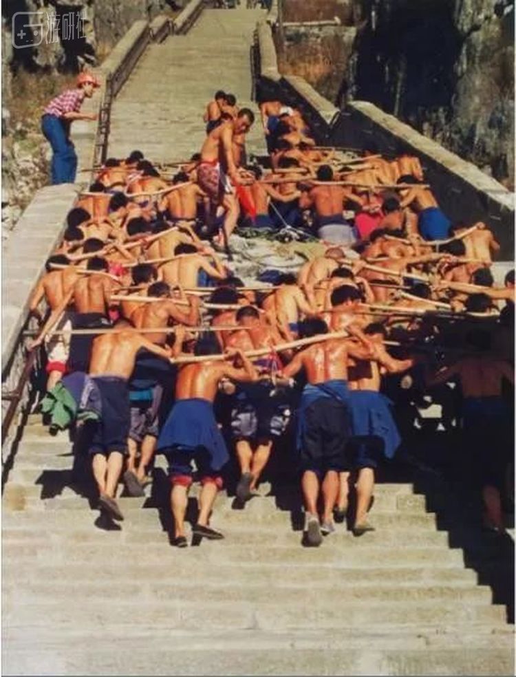说到挑山工,大多数人第一个想起的应该会是作家冯骥才那篇入选语文课本的散文。“他们肩上搭一根光溜溜的扁担,扁担两头的绳子挂着沉甸甸的货物。”这是中国挑山工的标准形象,也是“挑山工”中“挑”字的由来。