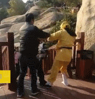 起因是一位小朋友在游览过程中发现了一只落单的孙悟空,当他选择上前互动的时候却被暴躁的大圣一脚踢飞。看到这一幕的小朋友爷爷上前理论,并最终与孙悟空扭打在一起。
