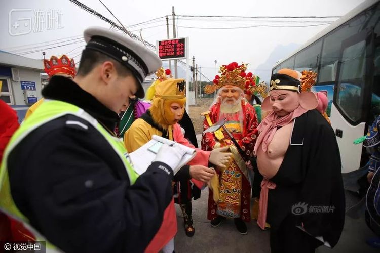 但神仙们在交警面前可没有什么特权,司机“孙大圣”向交警拿出驾照,并按要求当场除去顶戴花翎和驾照上的照片比对。经过认真询问和登记后,交警将他们放行。