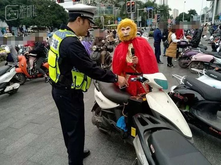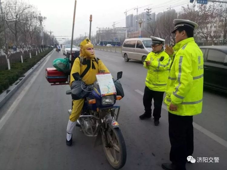 也是今年年初的事,山东济阳,路上一阵突如其来的DJ音乐吸引了交警的注意力。交警寻声望去,一装扮“孙悟空”模样的男子正骑着摩托车沿开元大街行驶,还不时故意做一些奇葩怪异的动作吸引过往市民注意。