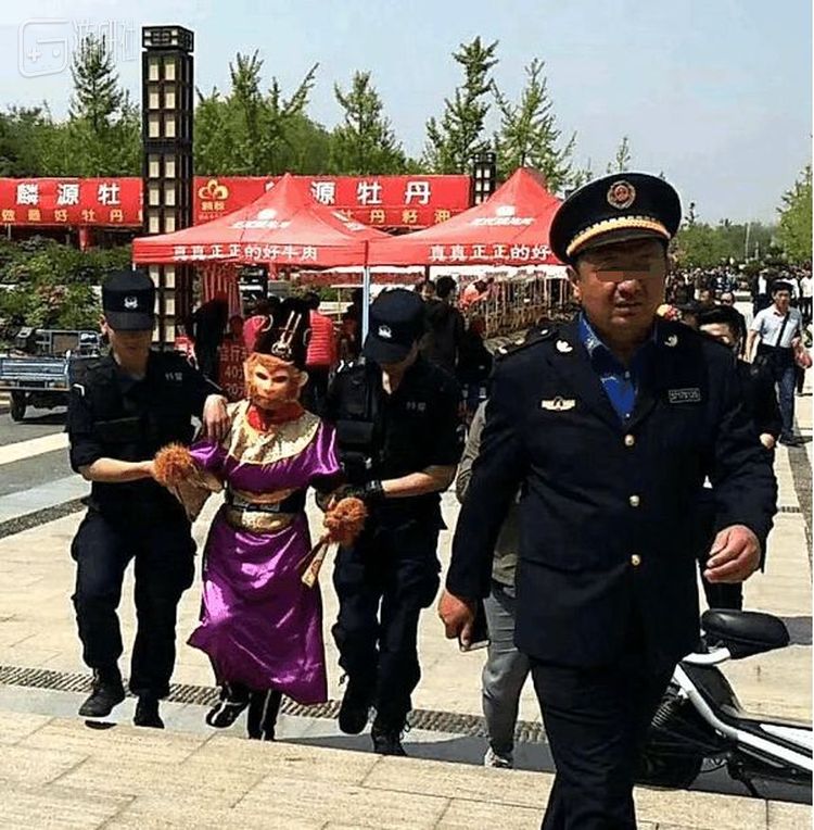 2018年4月16日,菏泽市城管行政执法支队、菏泽市公安局,在当地景区曹州牡丹园里,进行了一次“牛鬼蛇神”的大清洗行动。以孙悟空为首的大批神仙妖怪还没来得及上天,就被赶来的警察叔叔扭送到派出所中。民警对这些主动和游客合照并强行收费的“神仙”进行了教育批评,并没收了他们的行头披挂,打为凡人。