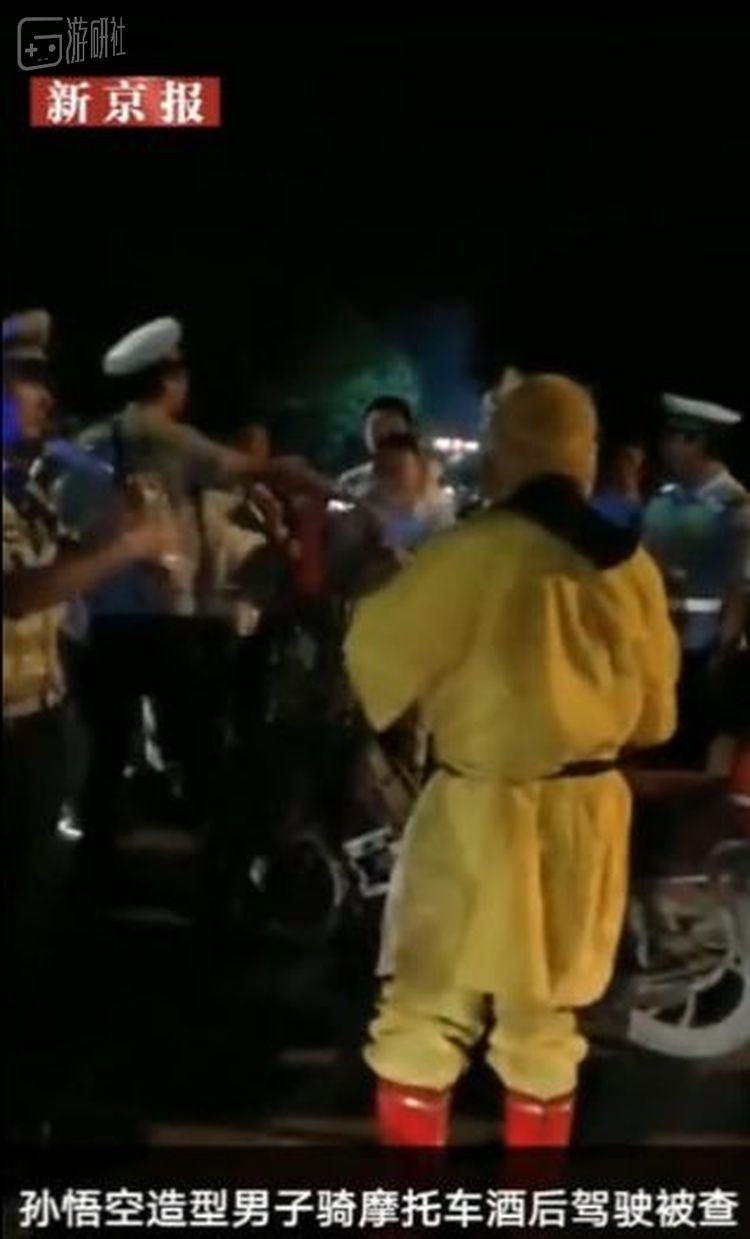 “ 结果他(孙悟空)转了一圈又兜回来 ,交警看到他这个摩托车没有牌照。一检查一交谈发现有酒味,带到大队经过吹气检测,酒精含量52。”