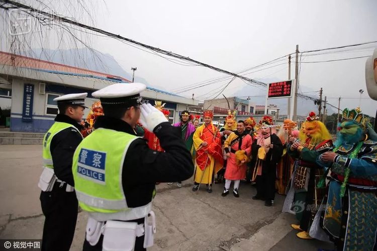 临走,这些“神仙”和“妖怪”们还拱手向交警问候和拜年,交警也礼貌的给他们回礼,热情地送了他们上路。