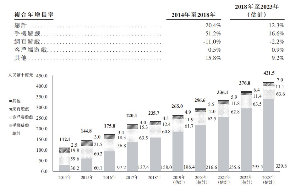 根据弗若斯特沙利文的报告,中国游戏市场在过去五年中的复合年增长率为20.4%,其中手机游戏的复合年增长率更是达到52.2%。虽然游戏业过去的增速极快,但对于未来弗若斯特沙利文却持谨慎态度。预计2018年至2023年,中国游戏市场的增速将由20.4%下降至12.3%;手机游戏产业的增速由51.2%骤降至16.6%。