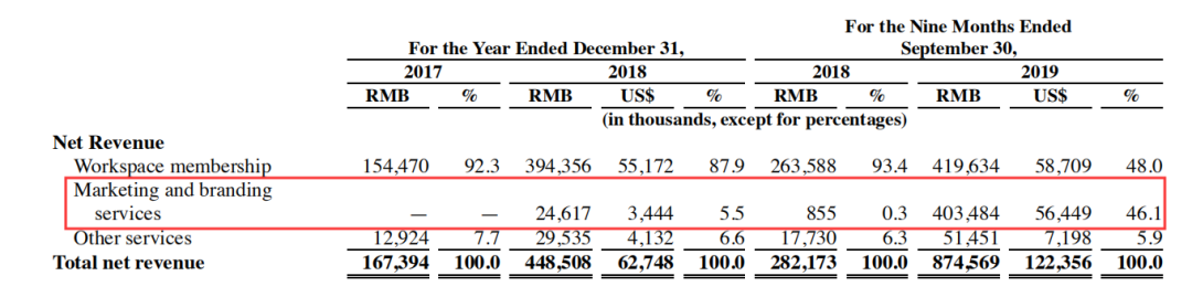 也就是说,市场及品牌收入几乎和办公空间社区服务的收入不相上下,贡献了近半数的营收。