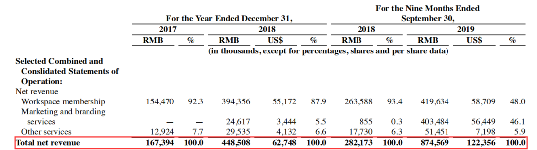 招股书显示,2017年、2018年以及2019年前三季度,优客工场总净收入分别为人民币1.67亿元、人民币4.49亿元和人民币8.75亿元。