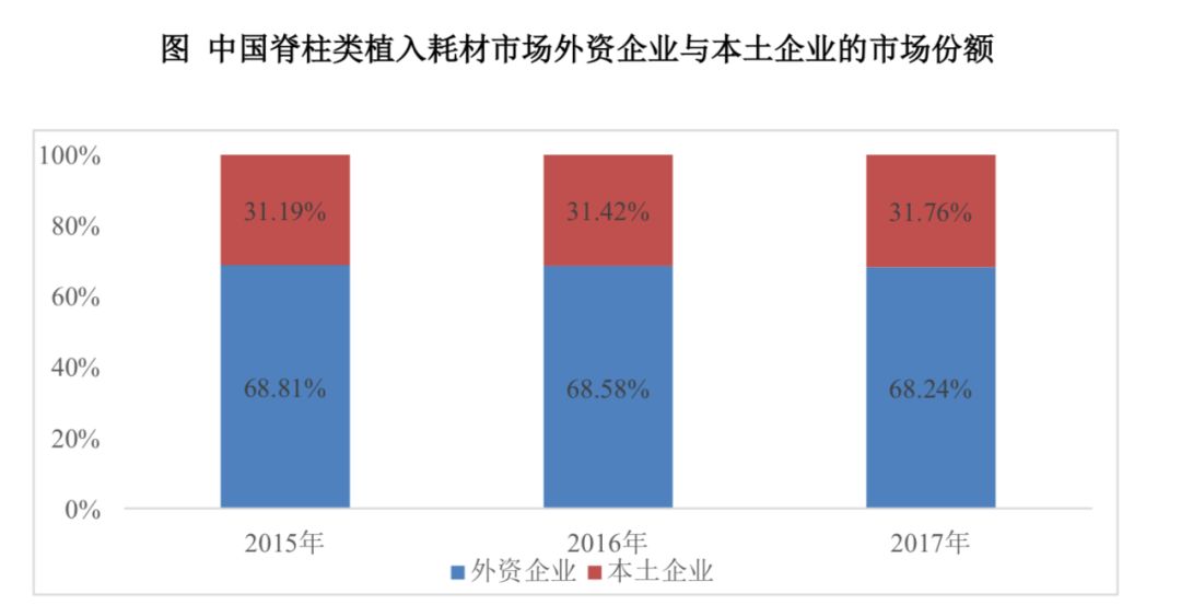 不过,由于骨科植入耗材产品生产最早开始于国外,且国外大型医疗器械制造商资金雄厚、技术先进,于是垄断了主要高端医用高值耗材产品的核心技术。目前国内骨科植入性耗材市场份额大部分被强生、美敦力、史赛克等国际品牌占据。国内企业产品目前还是主要集中在中低端。