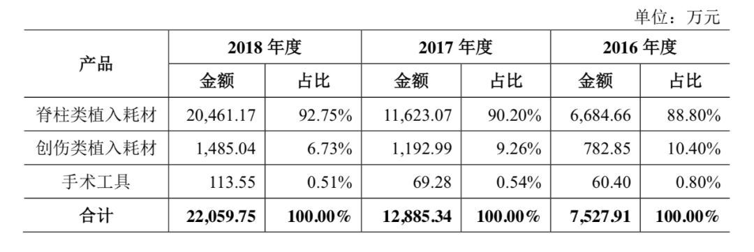 三友医疗成立于2005年4月,主营业务为医用骨科植入耗材的研发、生产和销售,主要产品为脊柱类植入耗材、创伤类植入耗材。脊柱类植入耗材是公司营收的主要来源,且此业务的营收占比在不断上涨: