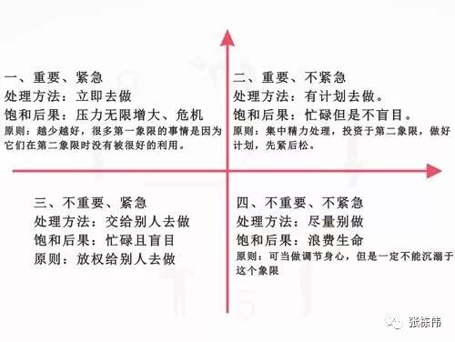 “四象限法则”是时间管理理论的一个重要观念,是应有重点地把主要精力和时间,集中地放在处理那些重要但不紧急的工作上,这样可以做到未雨绸缪,防患于未然。