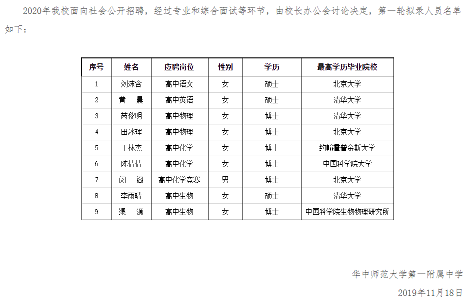 这不是某家国际巨头的人员公示,而是武汉华中师范大学第一附属中学的招聘名单。