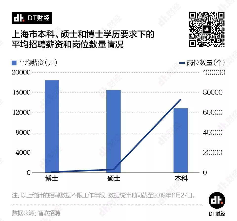 以上海为例,截至2019年11月27日,招聘学历要求分别是本科、硕士、博士的岗位数量分别是73242个、2806个和476个。