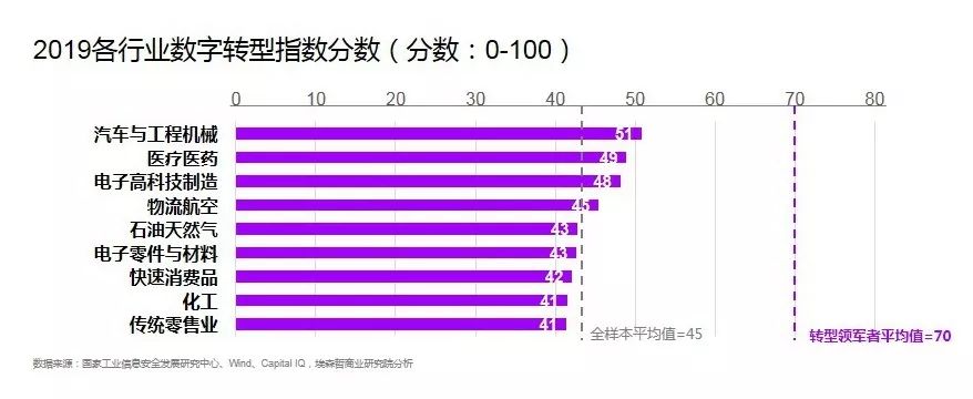 2019年中国企业数字转型指数平均得分为45分(满分100分),比去年提升了20%以上,但仍有巨大提升空间,转型领军者依然是少数派(9%的企业)。