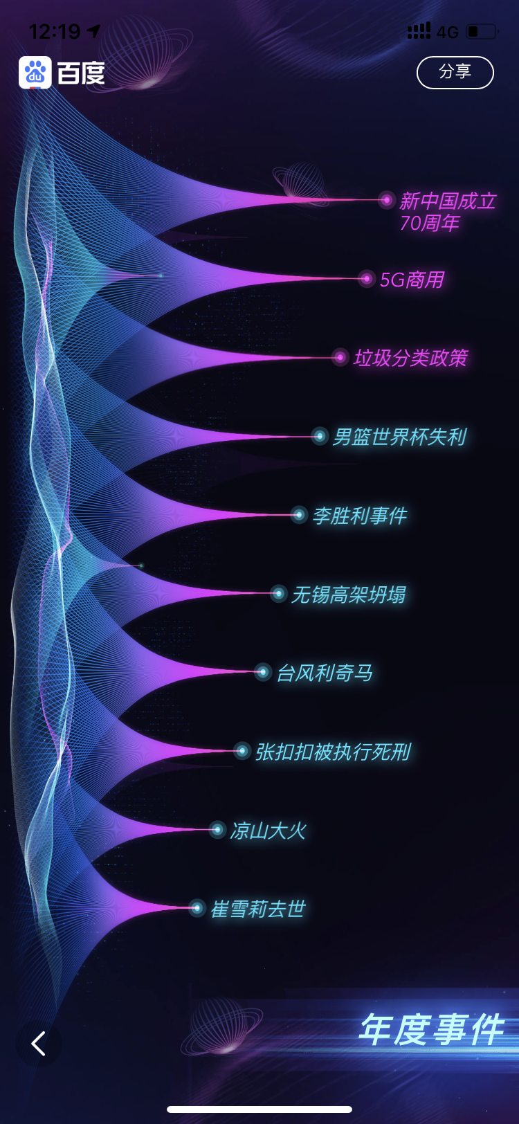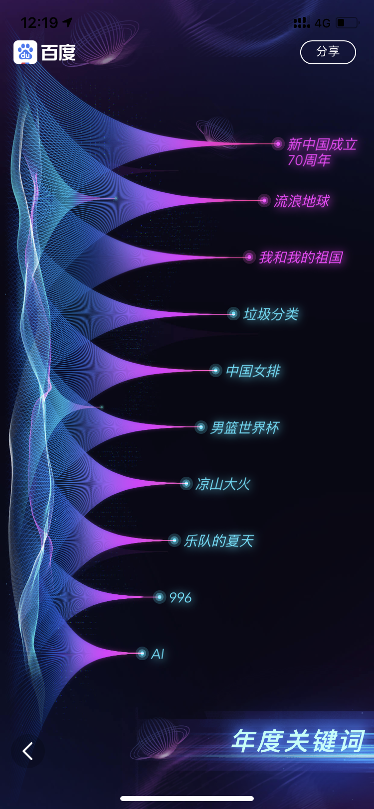 一部分的答案由百度给出。百度的2019年走得磕磕绊绊,股价下行,市值先后被拼多多、网易、美团超越,业务上受字节跳动、阿里等大公司挤压,在用户心里的美誉度也遭遇全面危机。从《搜索引擎百度已死》刷屏网络,到罗昌平名誉权案败诉,争议不断,但即便如此,它仍然是国内搜索引擎市场上的霸主。据Statcounter估计,百度在中国搜索引擎领域的市场份额超过70%。要想知道中国网民在关心什么,百度仍然是一扇不可或缺的窗户。