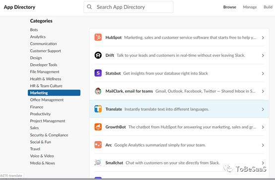 那Slack为什么就行呢?实际上,Slack从未把自己定位为一个纯粹的协作工具,而是知识聚合+业务集成。比如,从下图可以看出:它可以集成所有主流的市场应用(Marketing