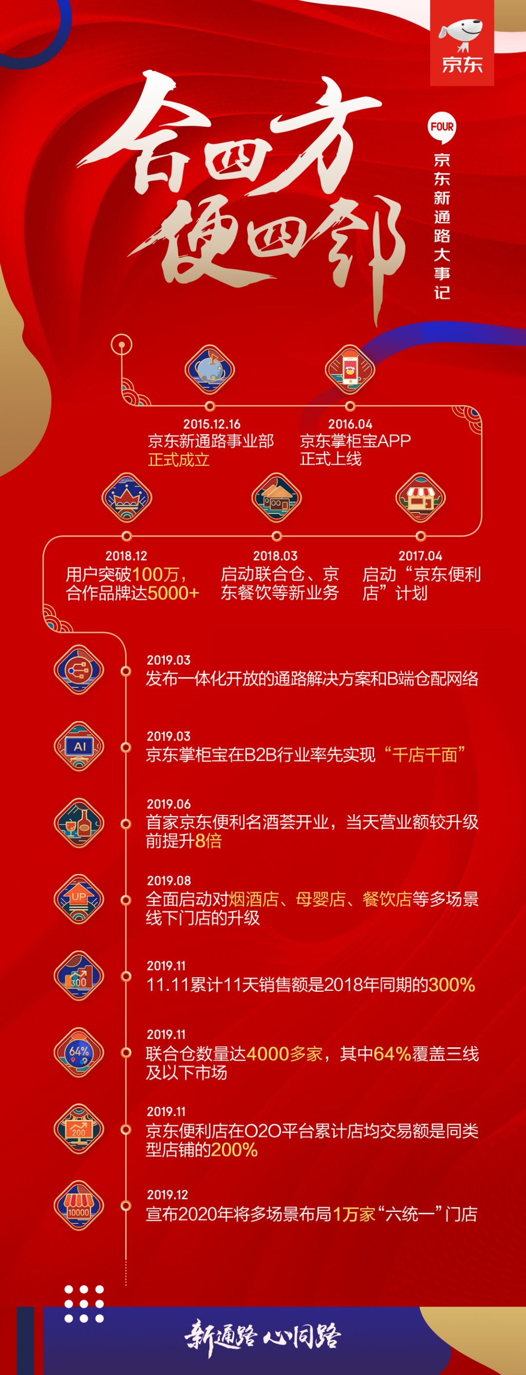 京东新通路不久前宣布会在新的一年继续推进相关业务,目标是在2020年新增1万家“六统一”门店。而覆盖的范围将不局限于夫妻店,包括母婴店、烟酒店、餐饮店、无人货架等更多的新业态也将涵盖其中,让“零售即服务”的半小时生活圈梦想能够真正落地。