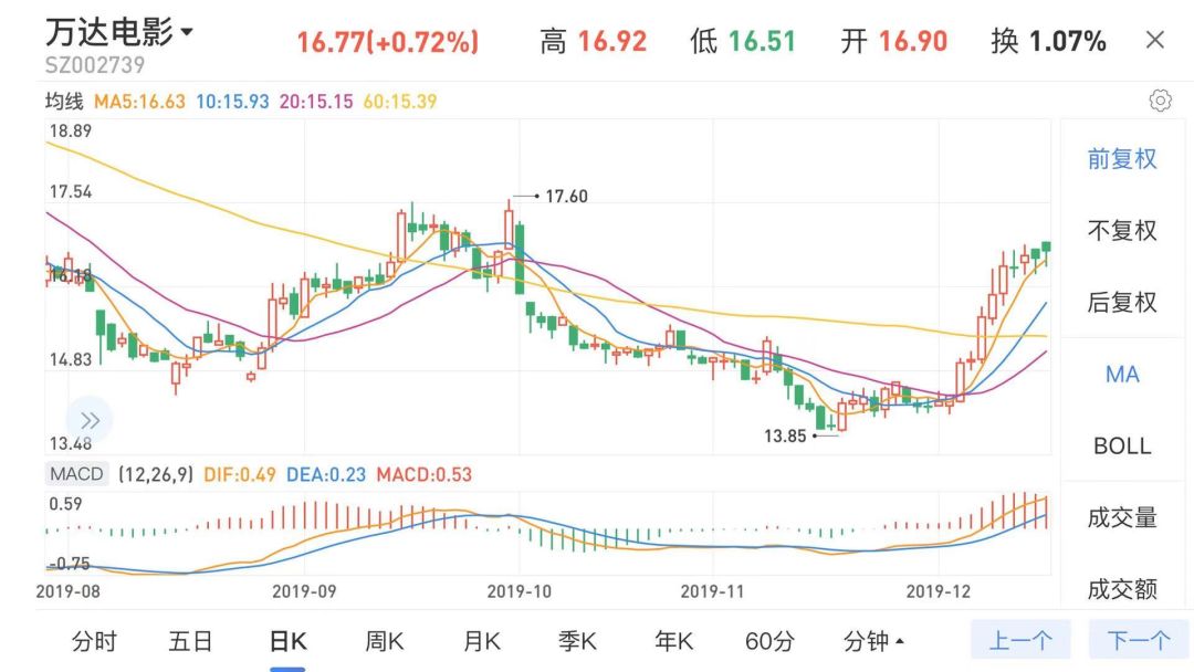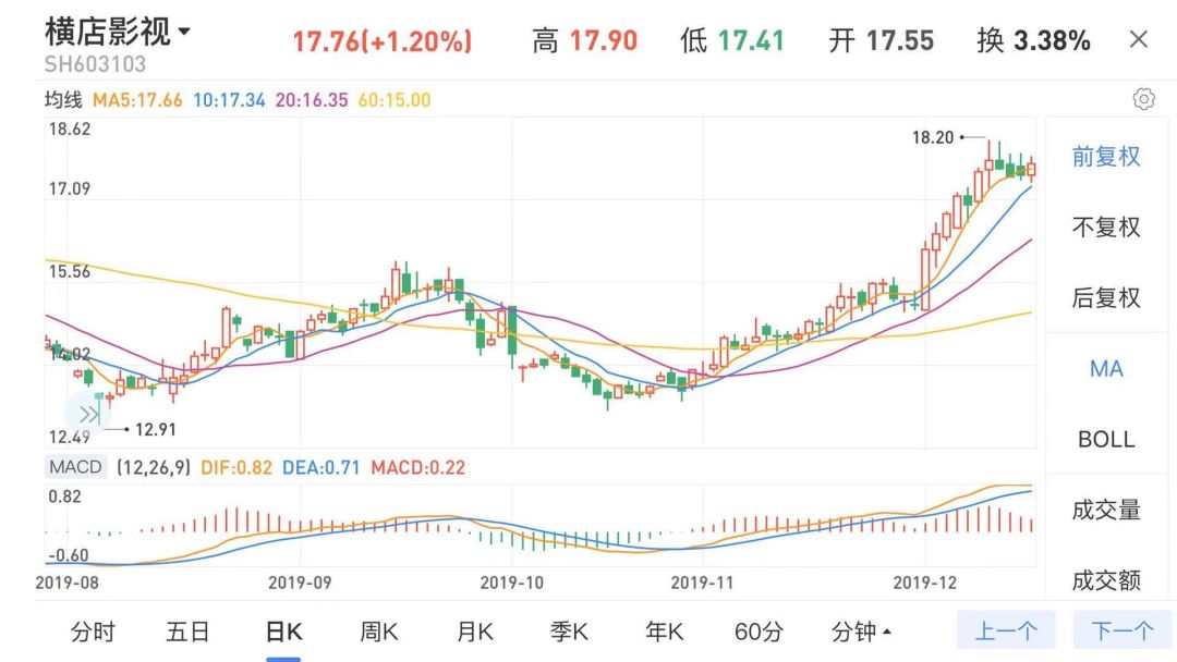 受《八佰》悬而未决的档期影响,主出品方华谊也备受关注,昨日华谊兄弟股价大涨7个点,今天又上涨了3个多点,股价受潜在爆款电影的影响就是如此的简单粗暴。其实,随着贺岁档的到了,春节档的临近,被资本抛弃许久的影视股已经活跃一个月有余了。慈文传媒自12月以来,涨幅超过60%,光线传媒股价创1年内新高,12月16日收盘价为11.80元/股。