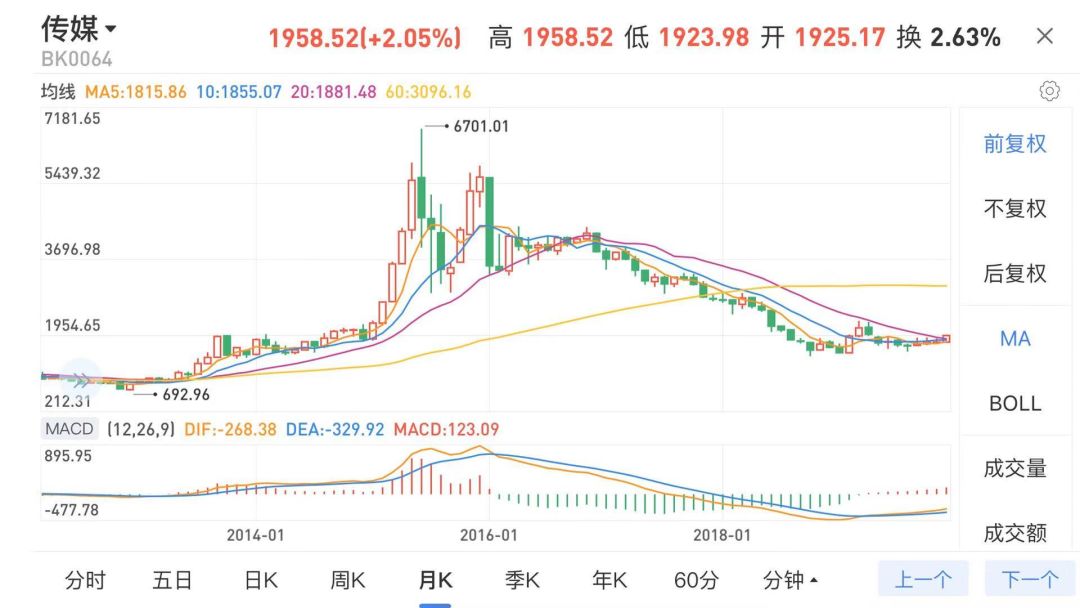 传媒指数从2015年高点到2019年1月,跌幅接近80%,PE从当初超过100,跌落到25左右。随后,传媒板块在今年2、3月触底反弹,接着传媒板块又出现了回落。反弹和反转很难确定,但是我们可以思考下,影视公司所处的环境怎样,影视行业的监管环境是否宽松了,资本是否流向了影视行业,目前来看都没有发生。