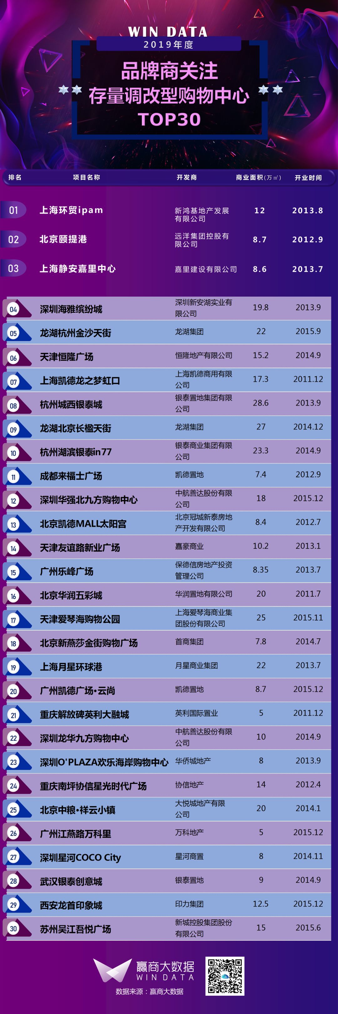 测评范围:赢商大数据重点监测、商业发展水平领先的21个城市(北京、上海、广州、深圳、杭州、重庆、青岛、合肥、南京、苏州、福州、贵阳、天津、武汉、成都、西安、郑州、昆明、厦门、泉州、福州),2011-2015年开业、商业面积5万㎡及以上、2019年品牌调整率15%及以上的近200个购物中心,测评出综合发展指数位居前列的30个存量调改型项目。