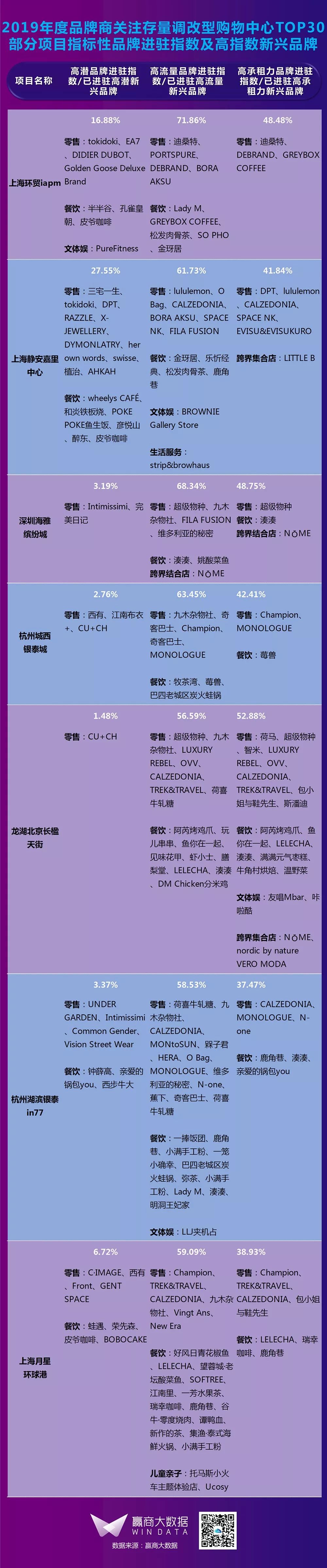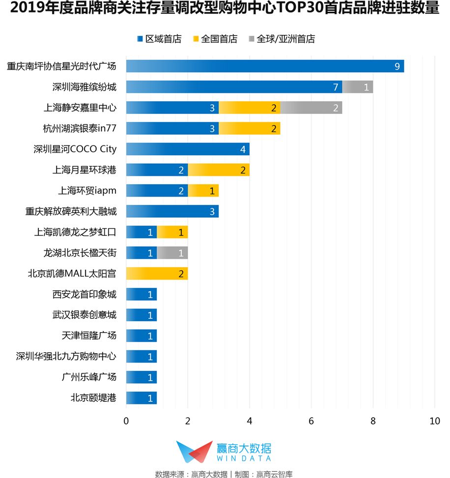 TOP30中,2019年引进了首店品牌的项目过半数,共17个;在调入新兴品牌时,稀缺性和话题传播力强的首店品牌,能为存量项目刷新存在感。