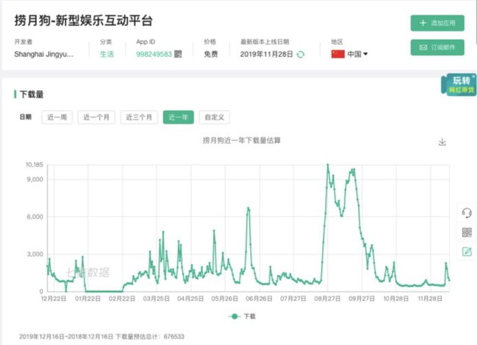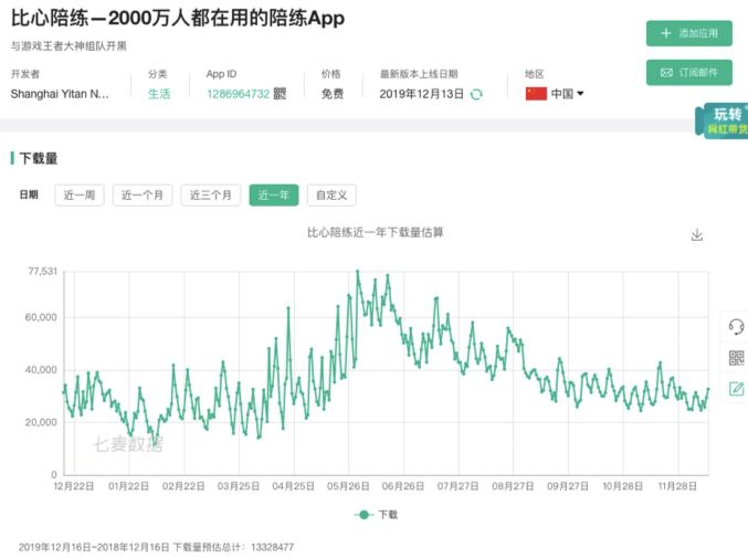 (图为2018年12月16日至2019年12月16日,比心陪练与某陪练App在iOS端的下载量预估对比。数据来源:七麦数据)