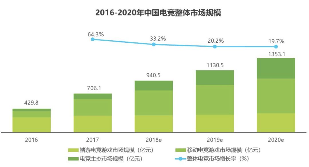 根据艾瑞咨询最新发布的《2019年中国电子竞技行业研究报告》显示,中国电竞市场的未来增长主要来自电竞生态市场,预计在2020年时中国电竞生态将占据27.8%的中国电竞市场份额,达到375亿。
