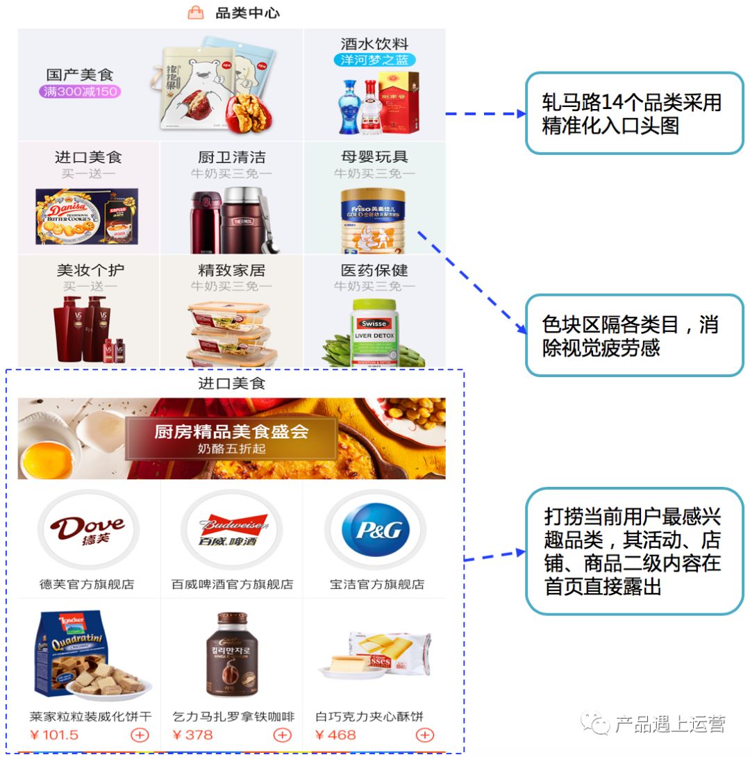 提升首页访问深度是个比较复杂的事情。我们先想一下线下大卖场的做法,常常把生鲜这类高频刚需品放在超市最深处。这样,大多数人要买生鲜,就不得不一路逛下去,穿过整个卖场,从而提升了所有品类的曝光机会。