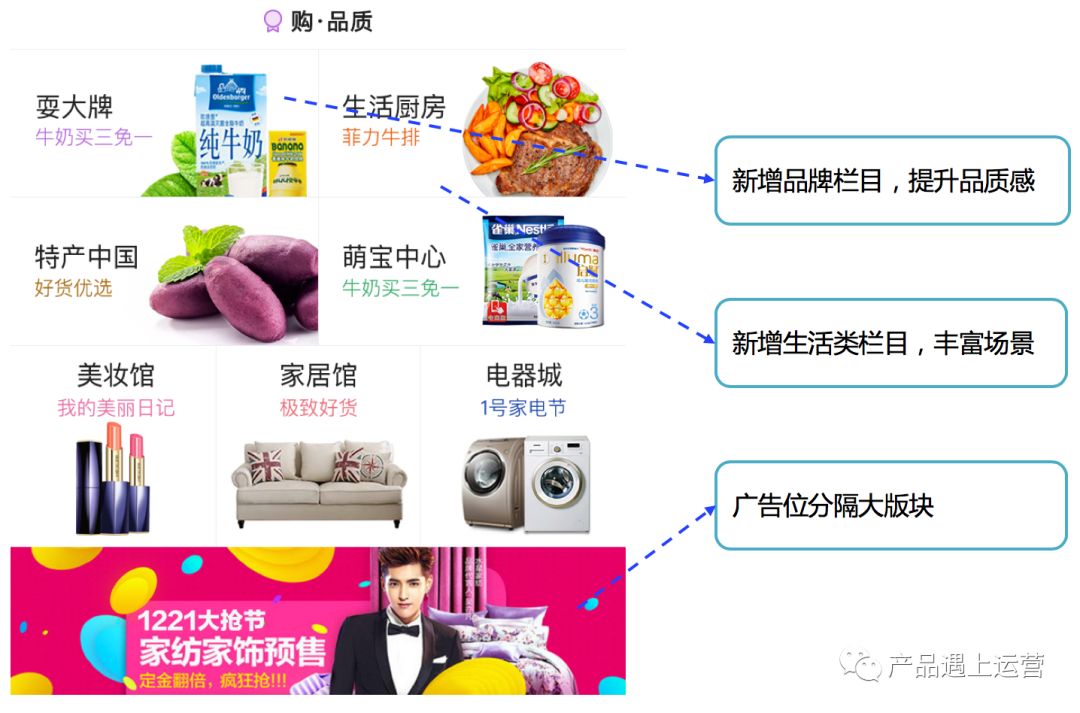 第三点看似简单,实践却十分困难。酒香就怕巷子深,如果商品要层层跳转到更深的页面上才能看到,逐级流量衰减严重,触达商品就很难。然而,把商品直接铺在首页上,“猜你喜欢”这种抓残值栏目中会获得一定的效果,但商品直铺首页,实践上我看到的数据却往往又是失败的。比如下面这个项目,原本频道入口如下: