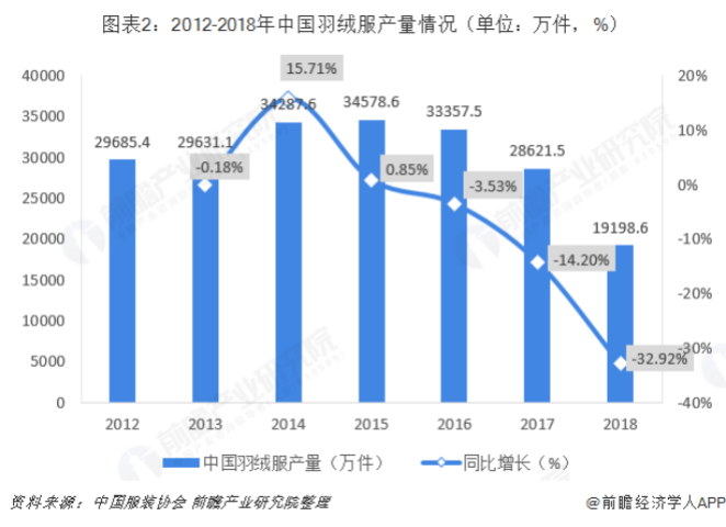 到了2018年,正值国际贸易摩擦加剧,中国服装出口大受影响,产量下滑。根据中国服装协会统计数据,2012年-2018年我国羽绒服行业整体产量呈波动下降趋势,2018年产量同比下降32.92%,创历史新高。