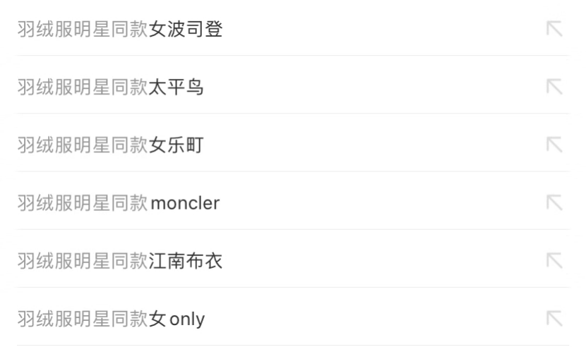 明星同款这么管用,国内羽绒服品牌们更是想出了一个绝招,在淘宝投放明星同款关键词。