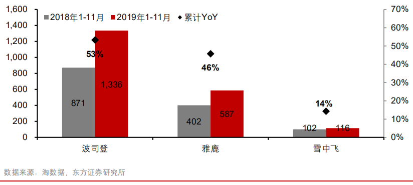 东方证券的报告显示,2019年11月,波司登、雅鹿、雪中飞在天猫店铺的销售额分别为9.09亿、2.89亿、0.63亿,分别同比增长43%、38%、73%。2019年1月-11月,波司登、雅鹿、雪中飞在天猫店铺的累计销售额分别为13.36亿、5.87亿、1.16亿,分别同比增长53%、46%、14%。