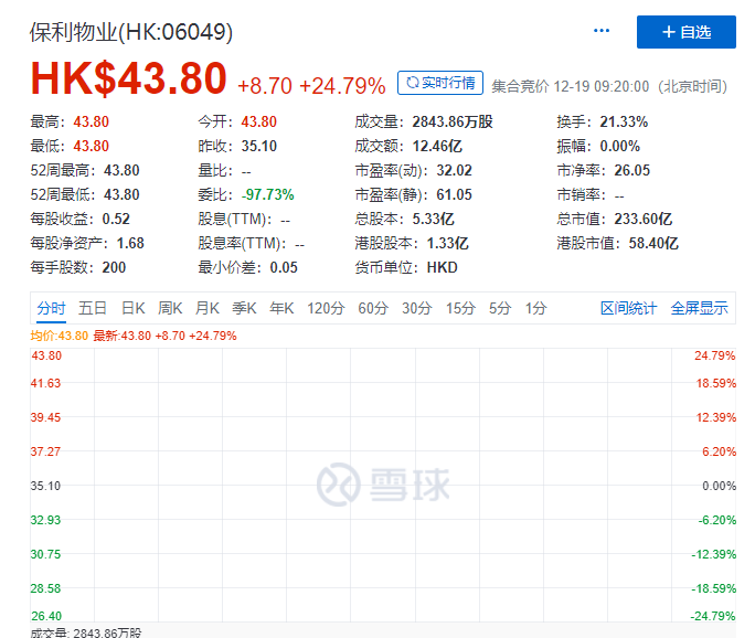 2019年12月19日,保利物业(06049.HK)正式于港交所主板上市。开盘价43.8港元,高开24.79%,市值233.6亿港元。