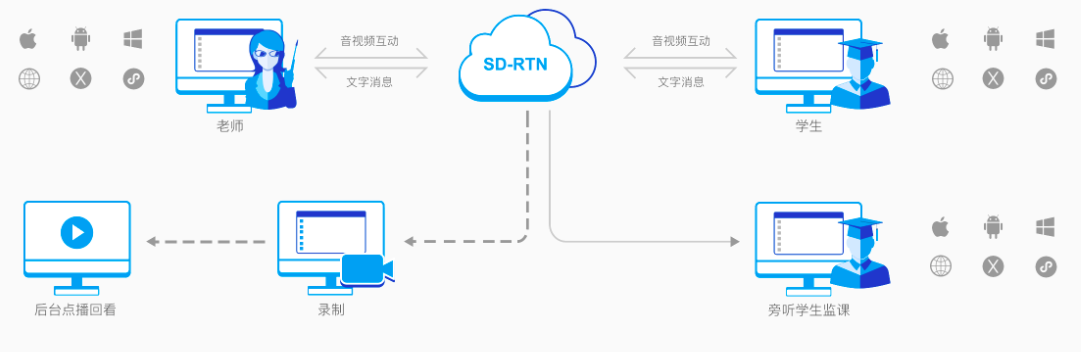 • 大班课:在海量高并发情况下,声网可以做到99.99%高可用、低延时;同时支持H5音视频,降低设备门槛;