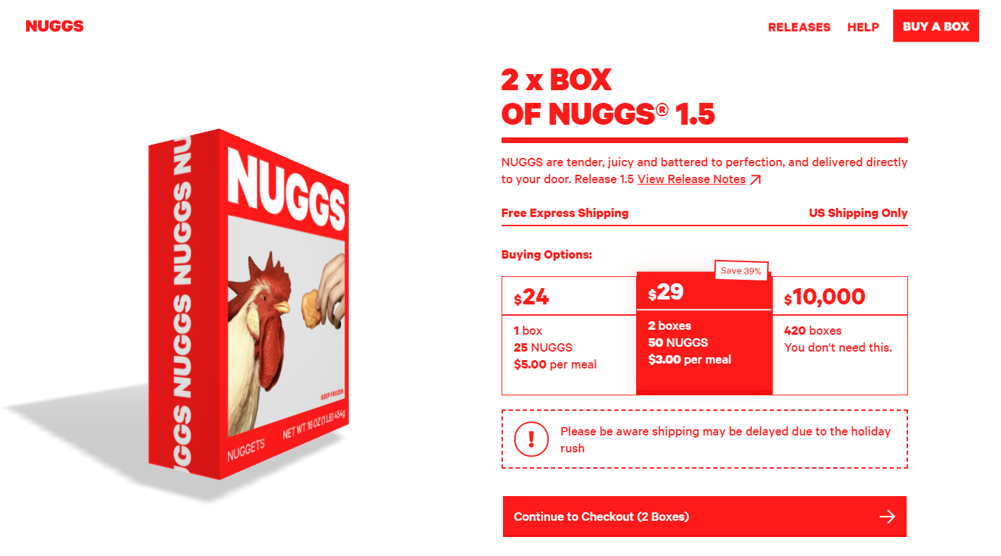 NUGGS的运营方式非常独特,其 产品开发方式就像应用程序一样 ,根据用户的反馈不断改进配方,并不断升级更新产品的版本,这周刚推出了 version1.5 。NUGGS目前只直接面向消费者销售,并计划在不久的将来扩展到零售和食品服务领域。